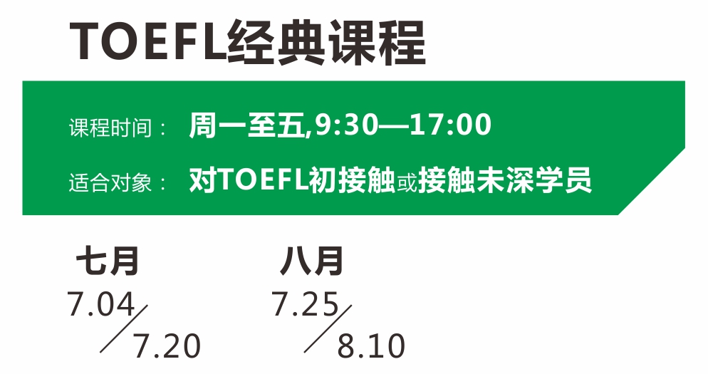 课程优势:该课程专门为英语基础较弱或从未接触过托福考试的学生量身定制。通过课堂上高强度的训练,老师在传授技巧的同时,针对学生问题现场同步讲解,让学生高效吸收,扎实提升学生的英语运用能力,帮助学生全面达到托福考试要求。